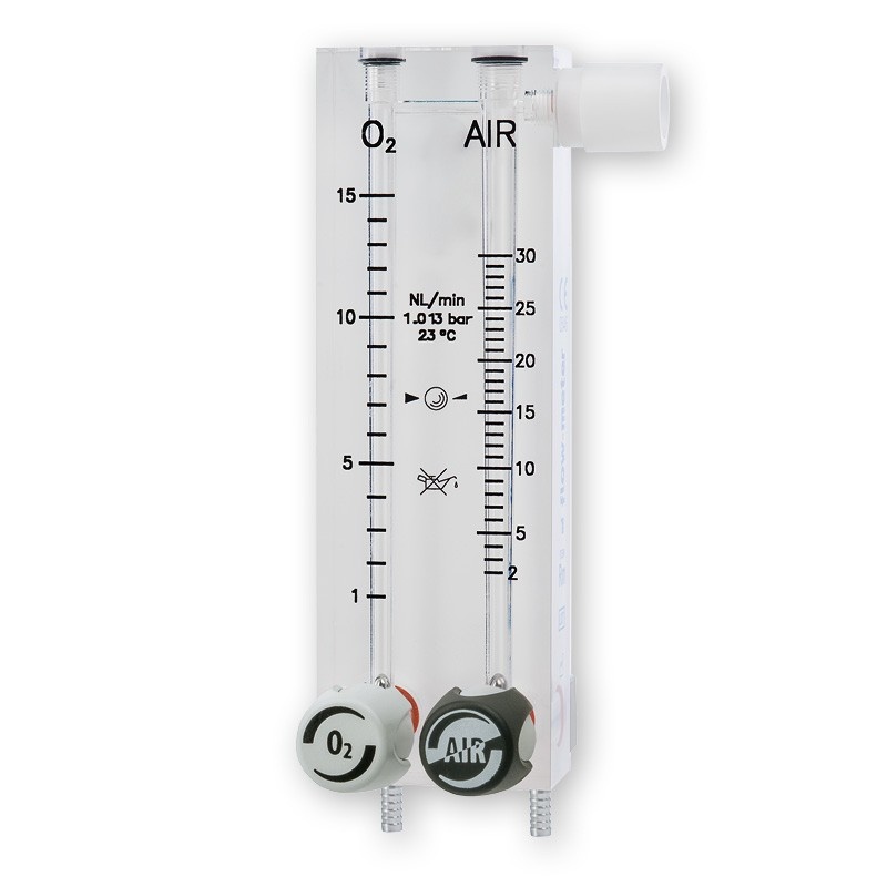I tubi di misurazione sono integrati all’interno del corpo dell’unità flussometrica e le connessioni di entrata si trovano nella parte inferiore del dispositivo e predisposte per la connessione al sistema centralizzato dell’ospedale oppure alle bombole complete di riduttori di pressione. Nel caso di utilizzo veterinario, un vaporizzatore per anestesia può essere connesso all’uscita dell’unità flussometrica.